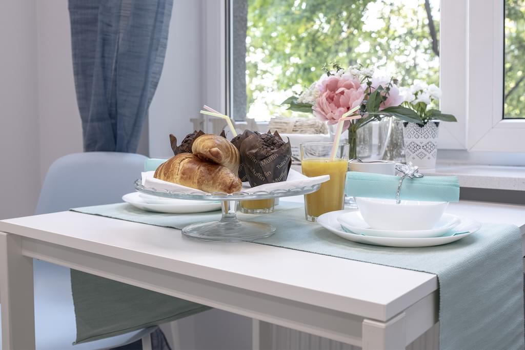 Kuchnia wyposażona jest w średniej wielkości lodówkę, która jest w zupełności wystarczająca dla dwóch osób przyjeżdżających nawet na wiele dni. Posiada płytę grzejną na 2 palniki. Kuchnia wyposażona jest we wszystkie podstawowe sprzęty. Można przygotować lub podgrzać dowolny posiłek. W mieszkaniu znajdują się sztućce, szklanki, kieliszki, talerze itp. Dostępny jest też ekspres do kawy Nespresso na kapsułki. Śniadanie można zjeść we własnym zakresie lub wybrać się do jednej z wielu restauracji w pobliżu, gdzie serwowane są śniadania (w sezonie letnim w ogródkach).
