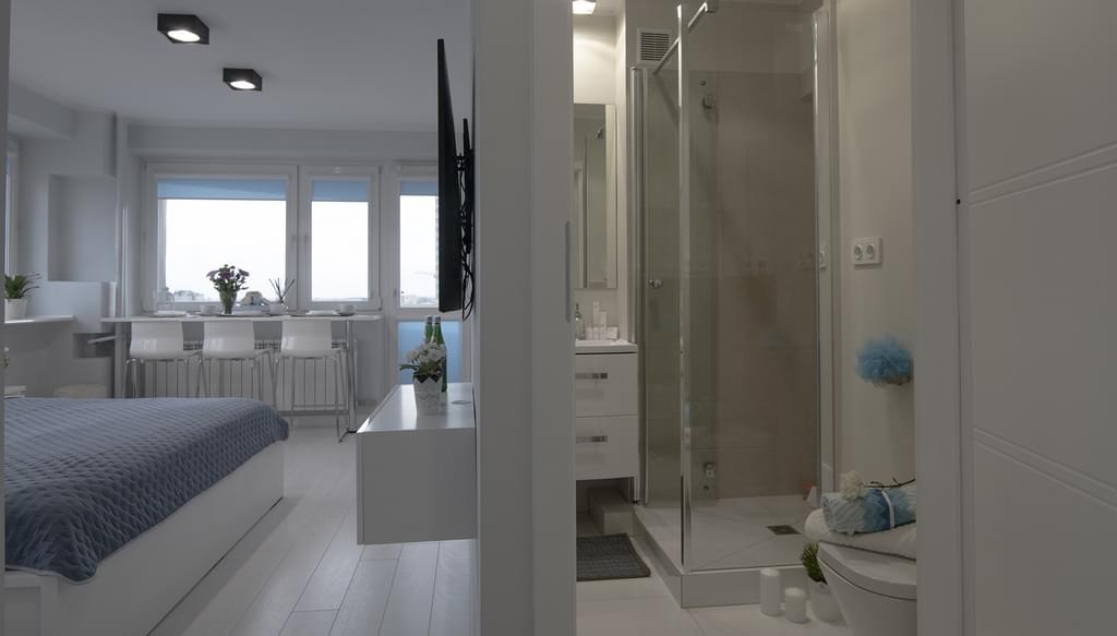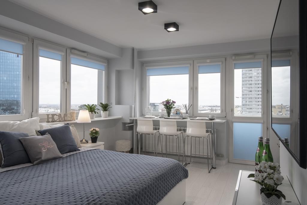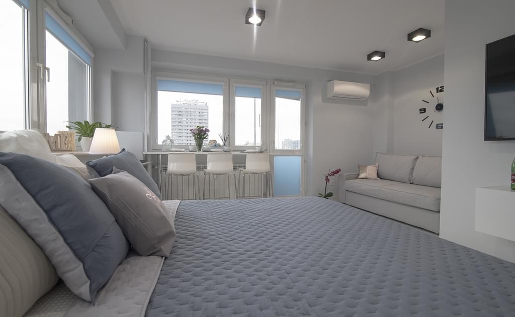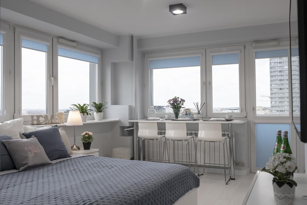 Kameralne studio z klimatyzacją i balkonem idealne do krótkich i długich pobytów w Warszawie.
