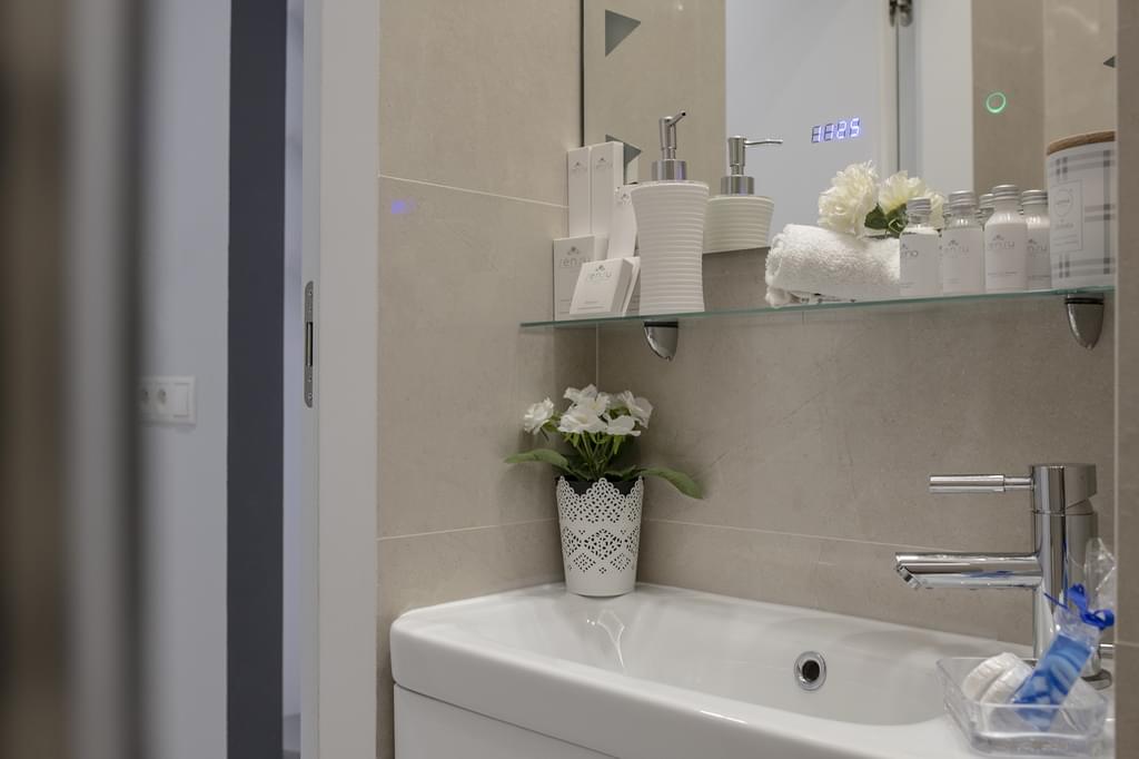 W łazience oferujemy bezpłatny zestaw kosmetyków oraz czyste ręczniki. Prysznic posiada baterię termostatyczną oraz deszczownicę. W łazience jest wbudowane radio oraz podświetlane lustro.