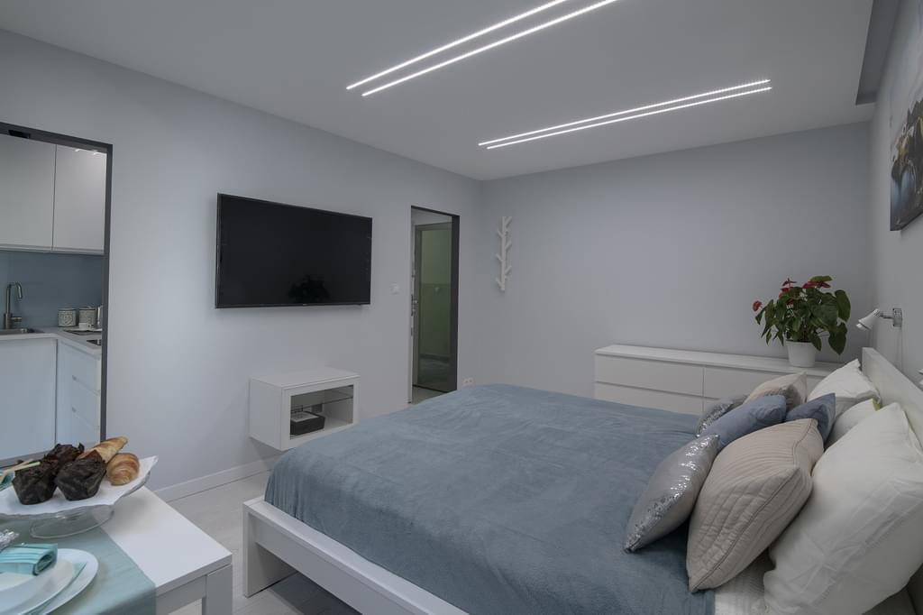 Łóżko ma szerokość 180 cm, co zapewnia komfortowy sen dla nawet 3 osób (dwie dorosłe i dziecko). W apartamencie jest ładowarka do urządzeń mobilnych, z trzema końcówkami (Samsung, iPhone, USB-C). Pojemna szafa pozwoli na łatwe utrzymanie porządku w przypadku dłuższych pobytów. W mieszkaniu jest deska do prasowania oraz żelazko, a także suszarka do włosów. W apartamencie znajdują się dwa krzesła oraz stół, na którym można komfortowo zjeść posiłek lub popracować na komputerze czy tablecie.