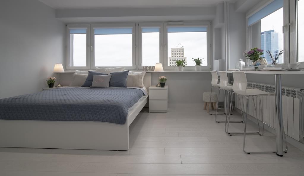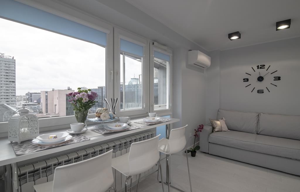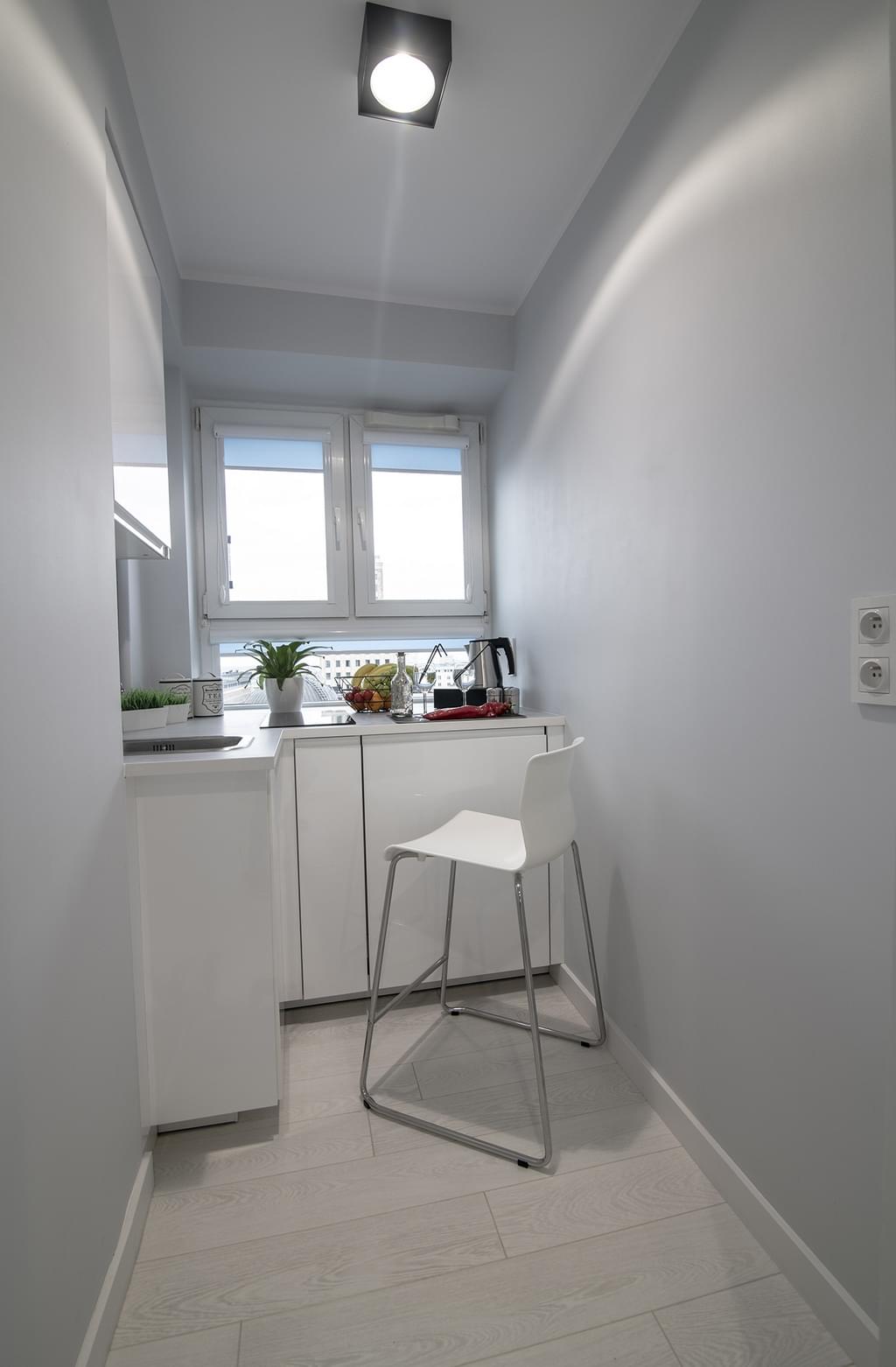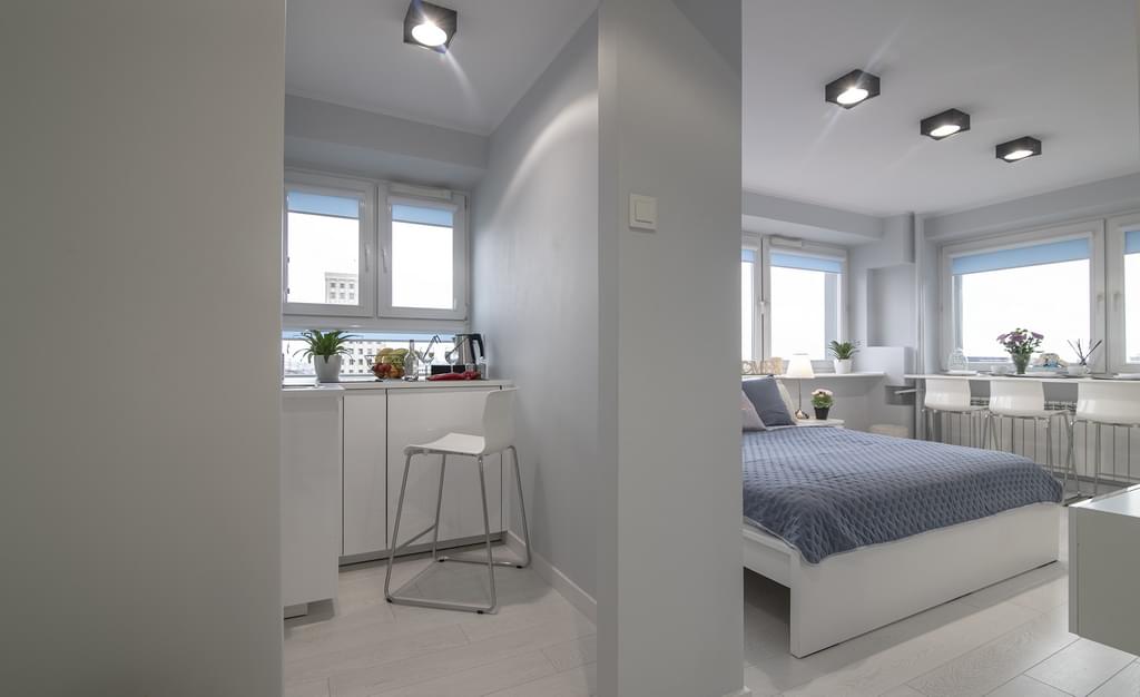 Kameralne studio z klimatyzacją i balkonem idealne do krótkich i długich pobytów w Warszawie.