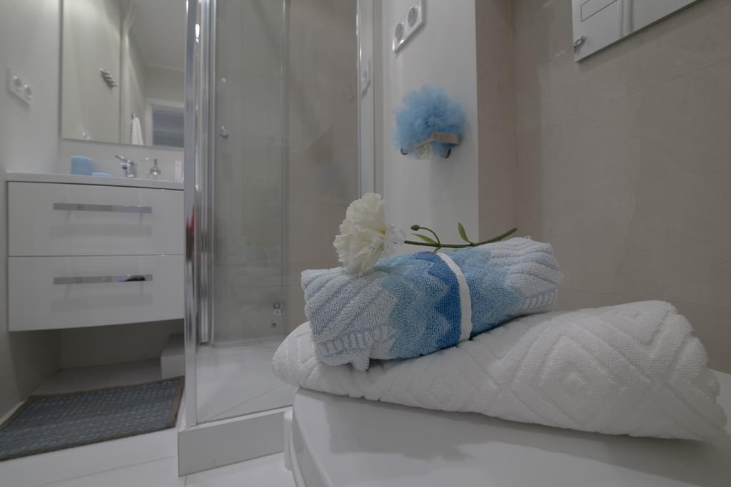 W łazience oferujemy bezpłatny zestaw kosmetyków oraz czyste ręczniki. Prysznic posiada baterię termostatyczną.